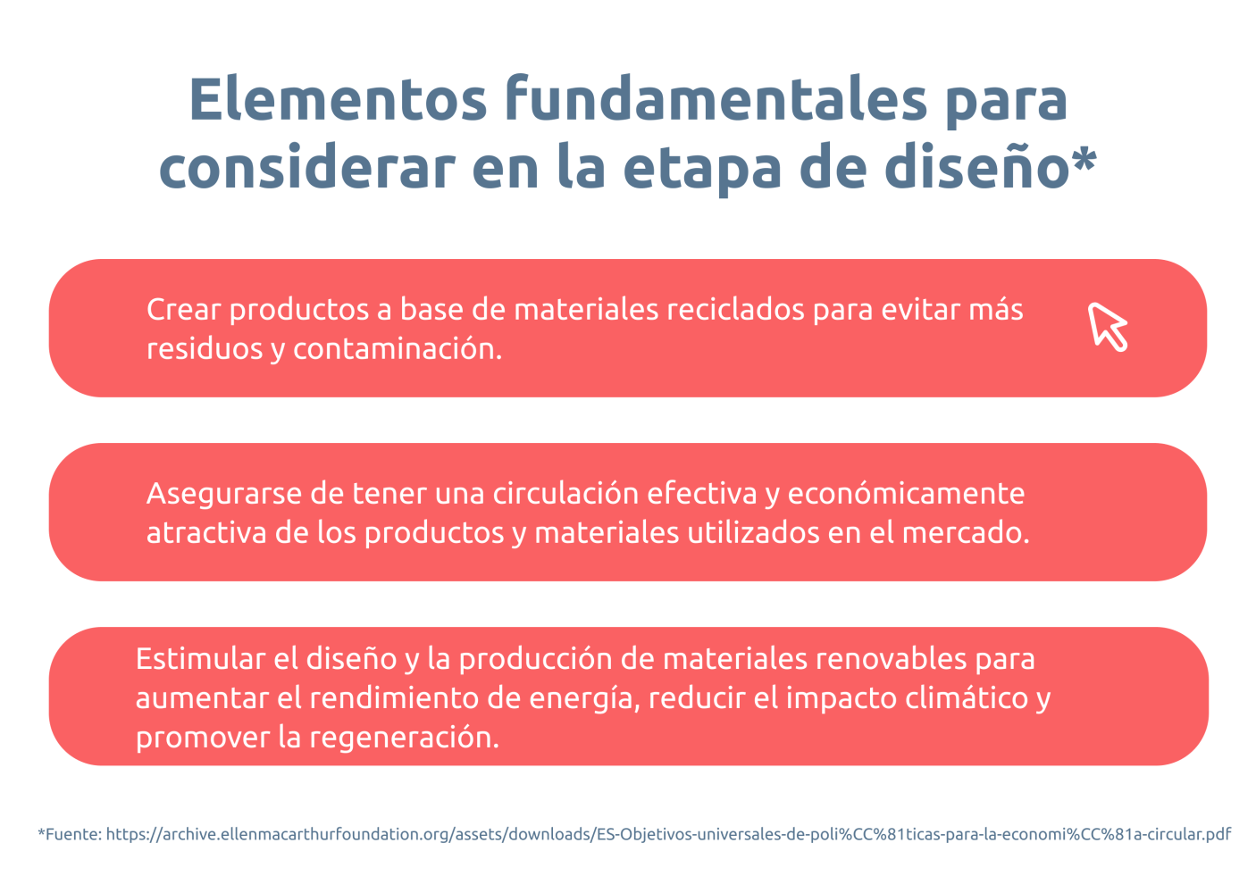 Todos los procesos, productos y servicios pasan por una etapa de diseño. En esta etapa se elige la forma en que se operan, fabrican, utilizan y consumen productos y/o servicios. A través de estas elecciones de modelos de productos y/o servicios, es clave que se tomen decisiones circulares.