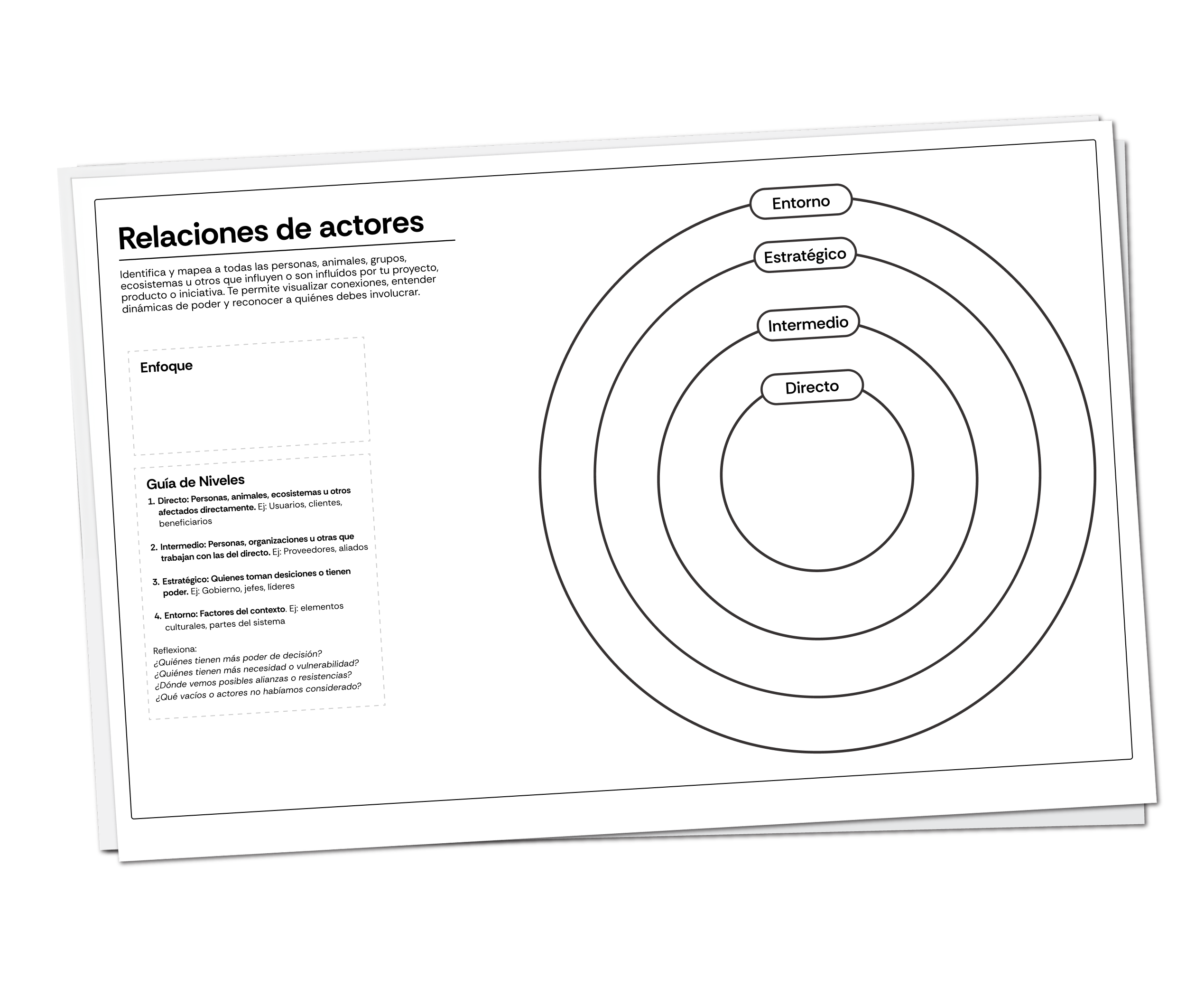 Identifica y mapea a todas las personas, grupos, ecosistemas u organizaciones que influyen o son influidos por tu proyecto. Esta herramienta te ayuda a visualizar conexiones, entender dinámicas de poder y reconocer a quiénes debes involucrar en cada momento.